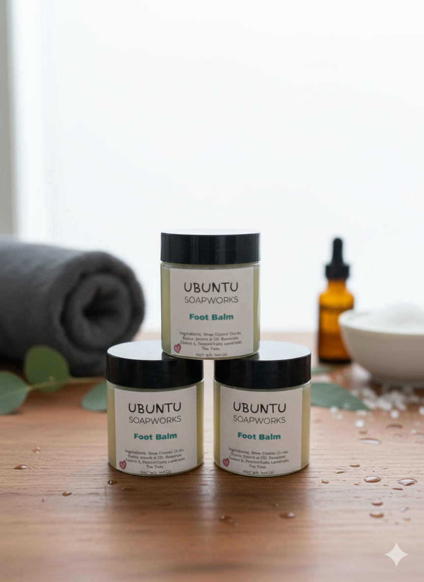 Soothe, soften, and refresh your feet with Ubuntu Soapworks Foot Balm, a rich and nourishing blend designed to deeply moisturize and protect dry, cracked skin.