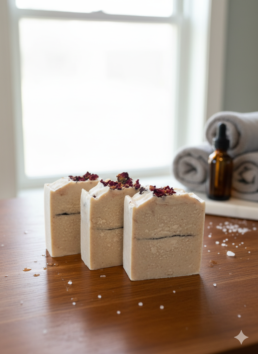 This artisan bar is made with a luxurious base of shea butter, almond oil, coconut oil, grapeseed oil, and olive oil — chosen for their ability to deeply moisturize, soften, and protect your skin. The result is a rich, creamy lather that cleanses gently while leaving your skin nourished and smooth.