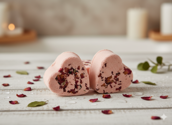 “A romantic rose water bath bomb with soothing calamine — floral, calming, and handcrafted for silky, refreshed skin.”