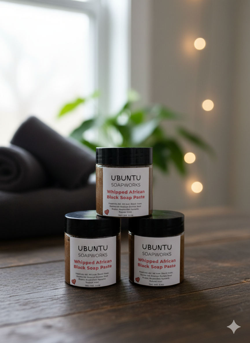 Experience the traditional cleansing power of African Black Soap in a modern whipped form. Our Whipped African Black Soap Paste is softened in rose water, then blended with jojoba oil, mango butter, and vegetable glycerin for a nourishing, skin‑loving base. Infused with cooling peppermint essential oil, this creamy, scoopable paste clarifies, soothes, and refreshes while leaving skin soft and hydrated.